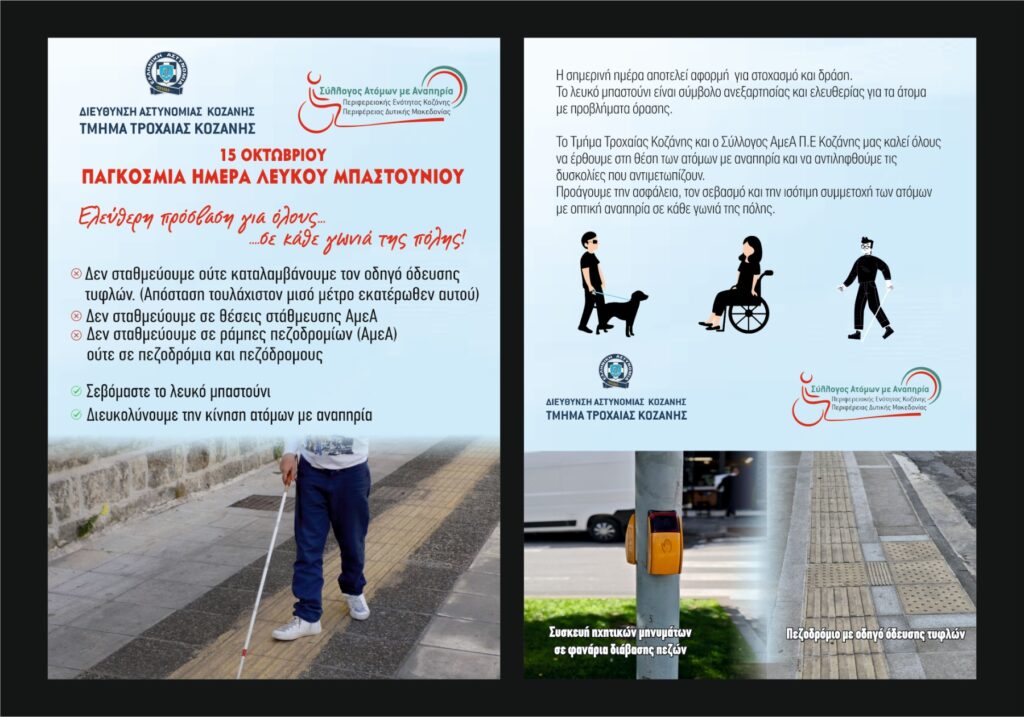 Η εν λόγω δράση πραγματοποιείται στο πλαίσιο της Παγκόσμιας Ημέρας Λευκού Μπαστουνιού (15-10-2025) με πρωτοβουλία του Διοικητή του Τμήματος Τροχαίας Κοζάνης, Αστυνόμου Α΄ κ. Ελευθέριου ΚΑΡΑΔΙΣΟΓΛΟΥ.